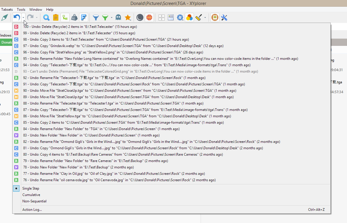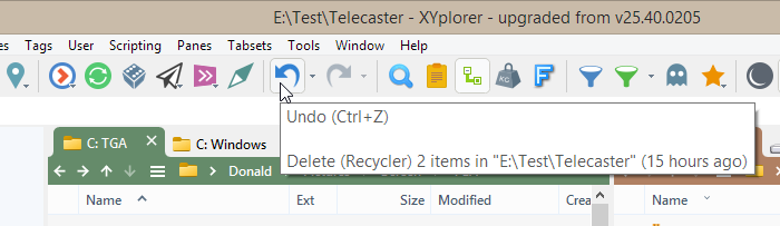 當事情出錯時,撤銷是您的好朋友。撤銷的一個典型用途是當您將某些項目拖放到了錯誤的文件夾——可能是手指一滑,即著名的意外拖放。您甚至可能不知道是哪個文件夾。有了撤銷功能,一次點擊就能恢復一切。即使是第二天早上關閉並重啓 XYplorer 之後也沒問題。